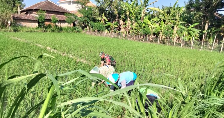 Magetan. - Babinsa Desa Pojoksari Koramil 0804/09 Sukomoro Kodim 0804/Magetan, Serka Tukiyo, turun langsung ke sawah membantu petani membersihkan hama rumput yang mengganggu tanaman padi di wilayah binaannya, tepatnya di Desa Pojoksari, Kecamatan Sukomoro, Kabupaten Magetan, Selasa (21/04/2026).